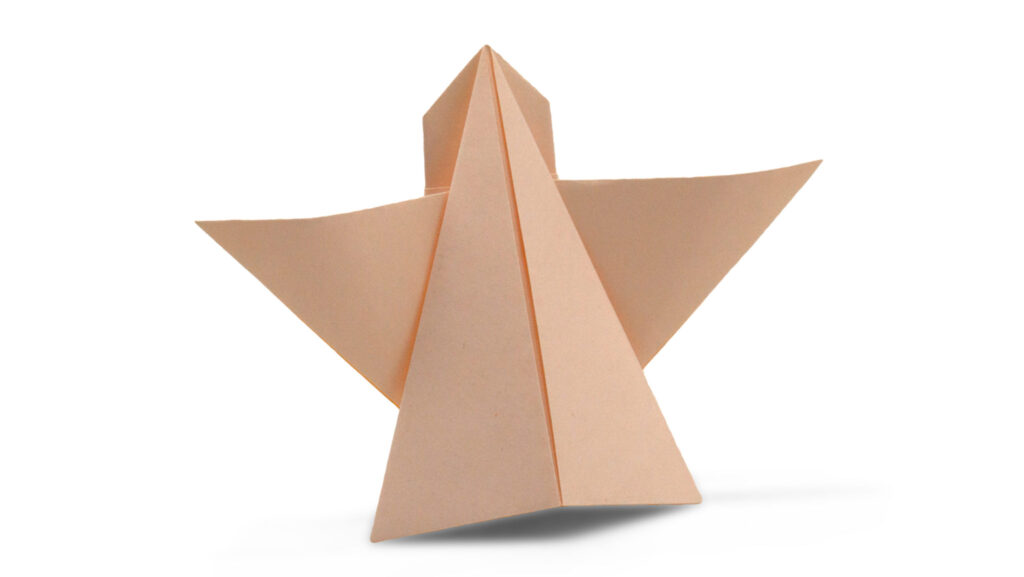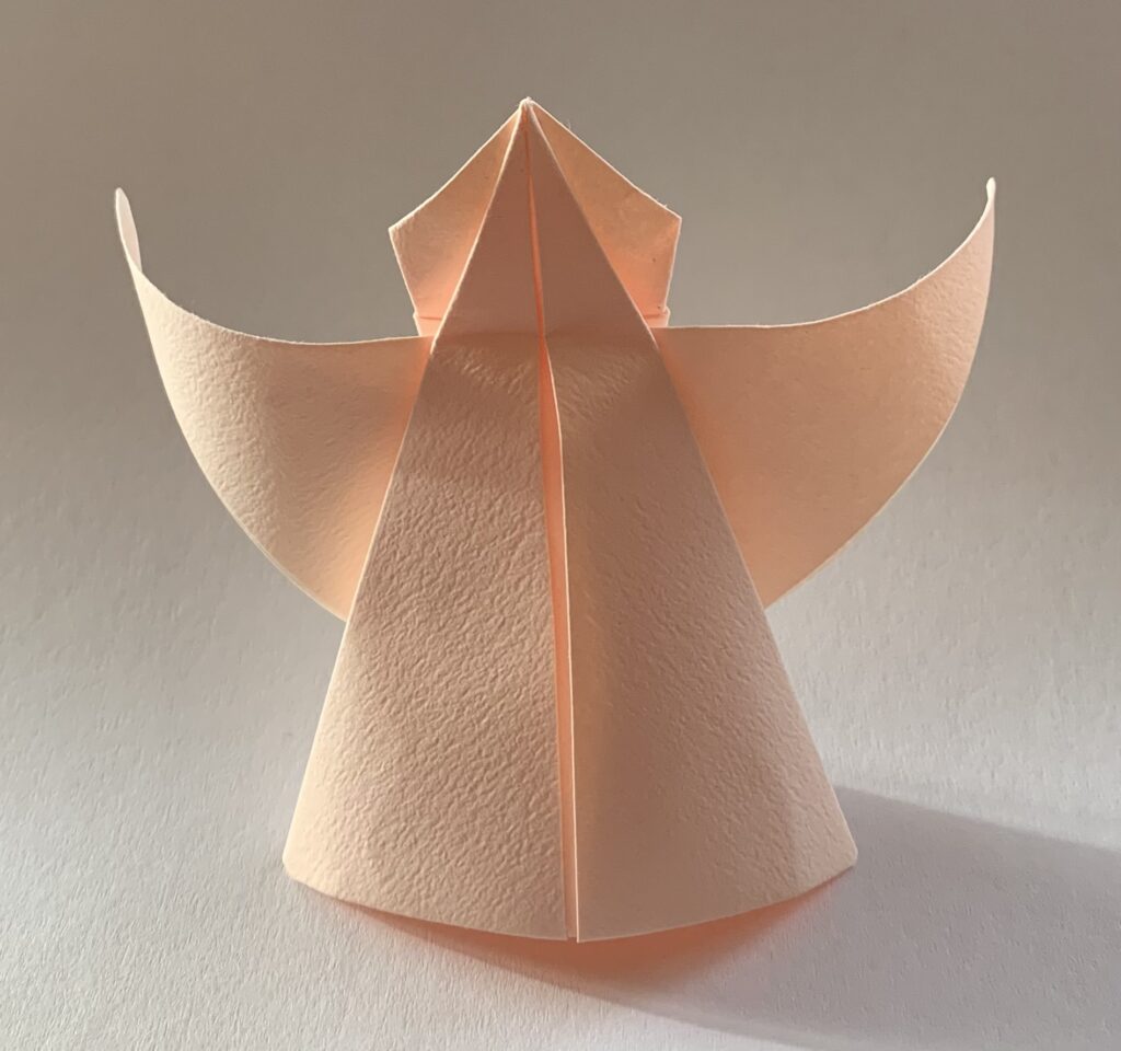 Derfor designede jeg denne engel. De stramme designkrav: 20 trin, 7 minutter, 400 tilhørere uden foldeerfaring, ledte til en simpel model med et rent og klart design: Vinger, kjortel og hoved med glorien.